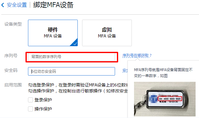 选择硬件 MFA 设备,填写序列号和安全码,依照页面指引进行绑定操作。