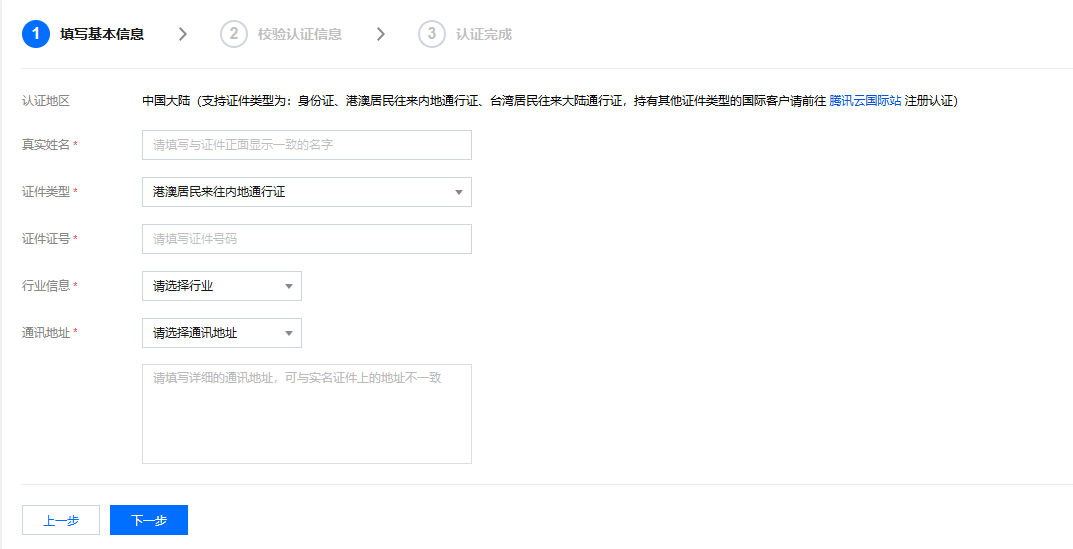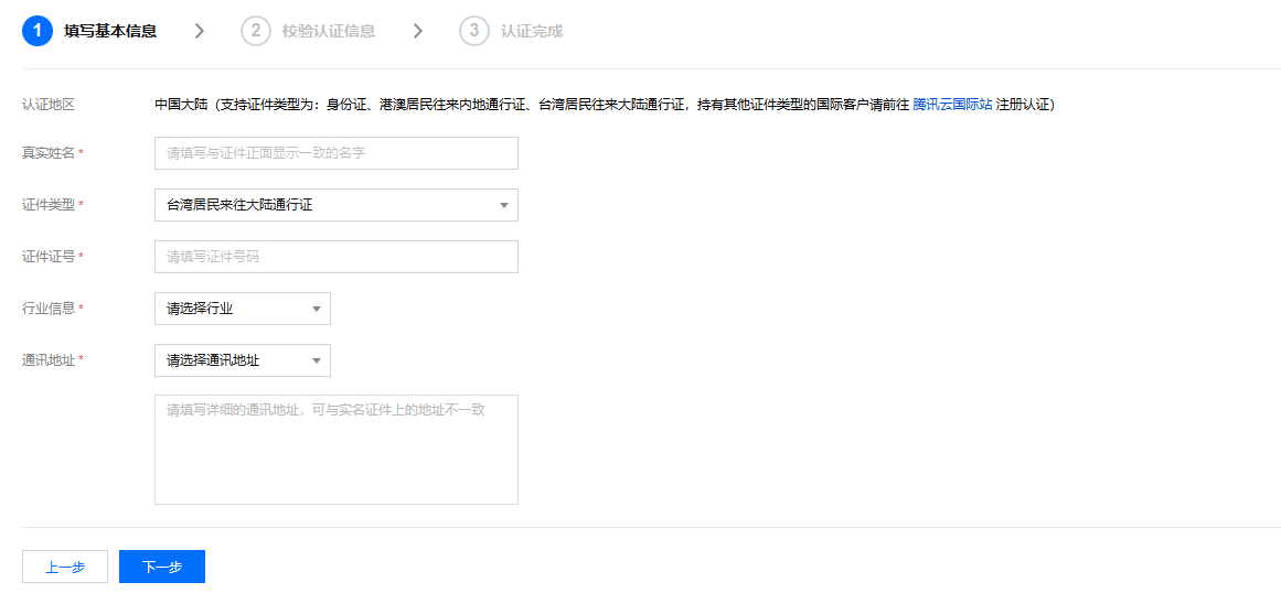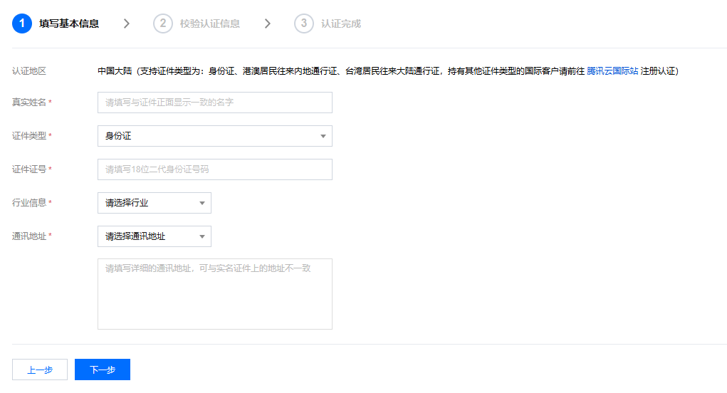 3. 在填写基本信息页面,填写真实姓名、证件类型、证件证号、行业信息和通讯地址,单击下一步。