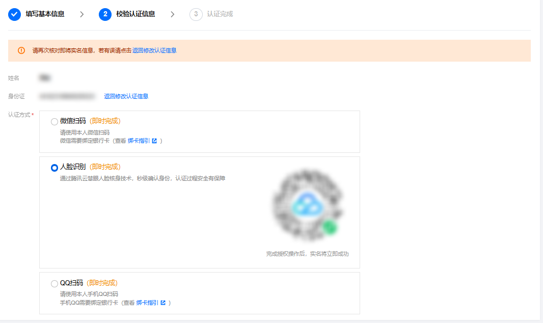 5. 认证方式选择人脸识别,打开微信扫一扫,扫描页面的小程序码,进行人脸识别,验证成功即完成实名认证。