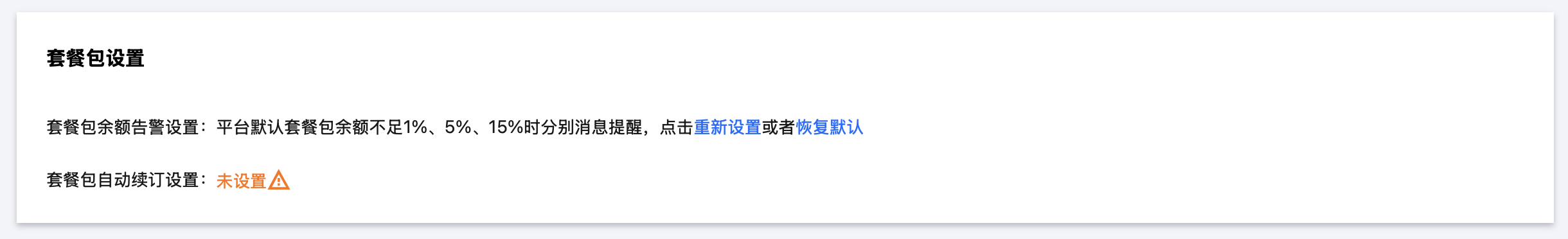 2. 平台默认套餐包余额不足1%、5%、15%时分别消息提醒 告警联系人。您可以单击重新设置来自定义告警余额或单击恢复默认来恢复平台默认设置。