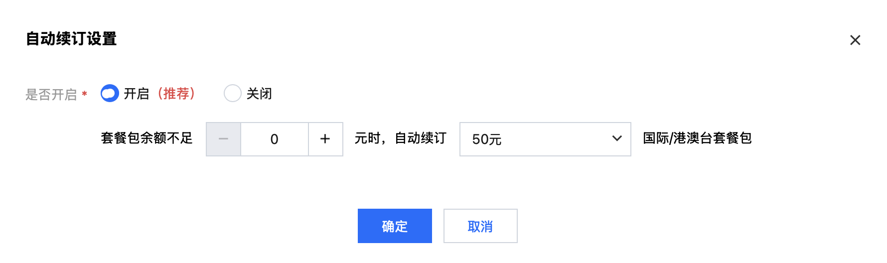 6. 设置成功后,每当满足自动续订条件时会自动续订并从您的账户中扣除设置的续订金额,详细费用请参见 国际/港澳台短信价格总览。