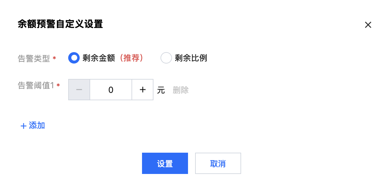 3. 单击重新设置后,您可以勾选告警类型(推荐选择剩余金额)并设置多个阈值(单击添加),单击设置确认。