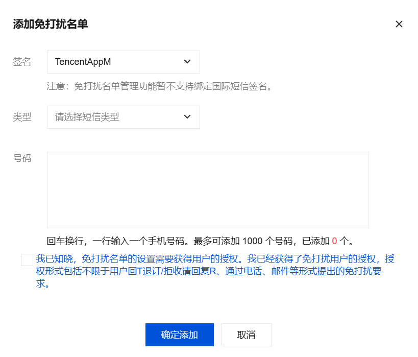 4. 国内短信免打扰名单,选择签名和短信类型,输入手机号码,并勾选对应授权要求提示。