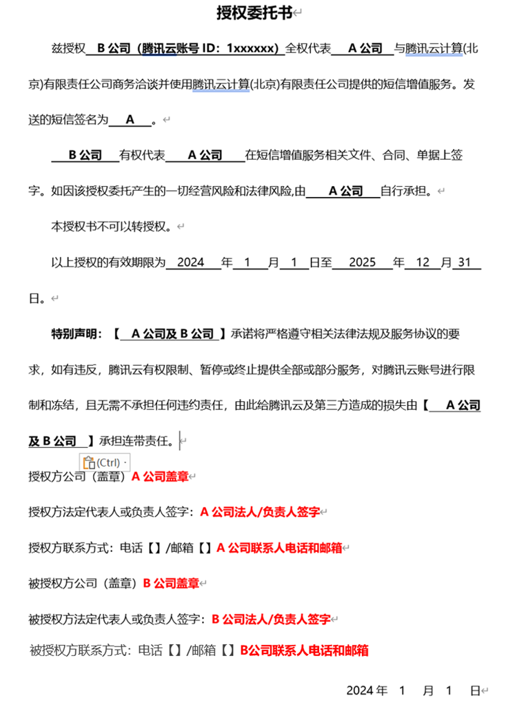授权书授权关系填反,正确的授权书中,被授权方是腾讯云账号所有方,授权方是短信内容的归属方。