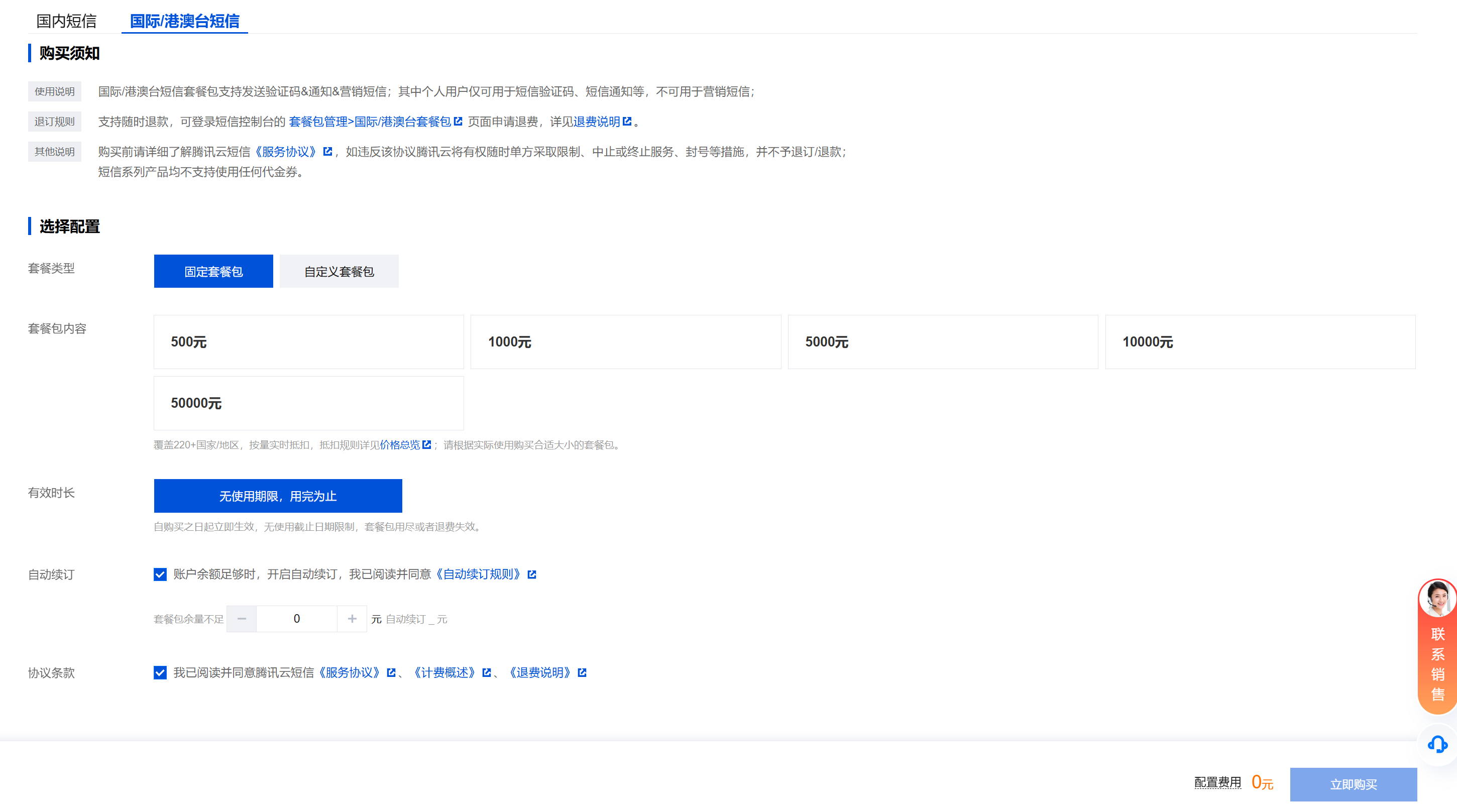 选择套餐类型、套餐配额,选择是否自动续订,并勾选我已阅读并同意腾讯云短信