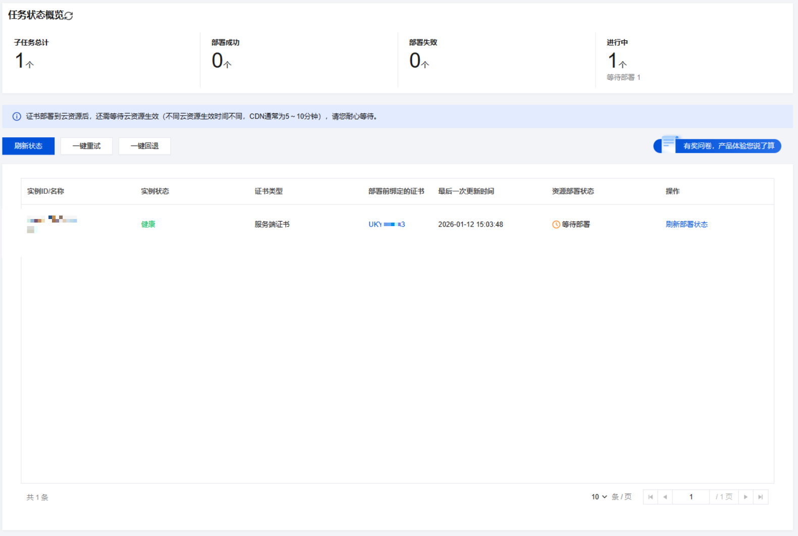 若部署错误,您可通过一键回退功能将云资源回退到这次部署前的证书。