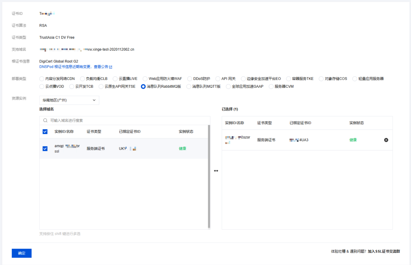 2. 在部署证书页面,部署类型选择消息队列 RabbitMQ 版,并选择跟证书域名匹配的实例后,单击确定。