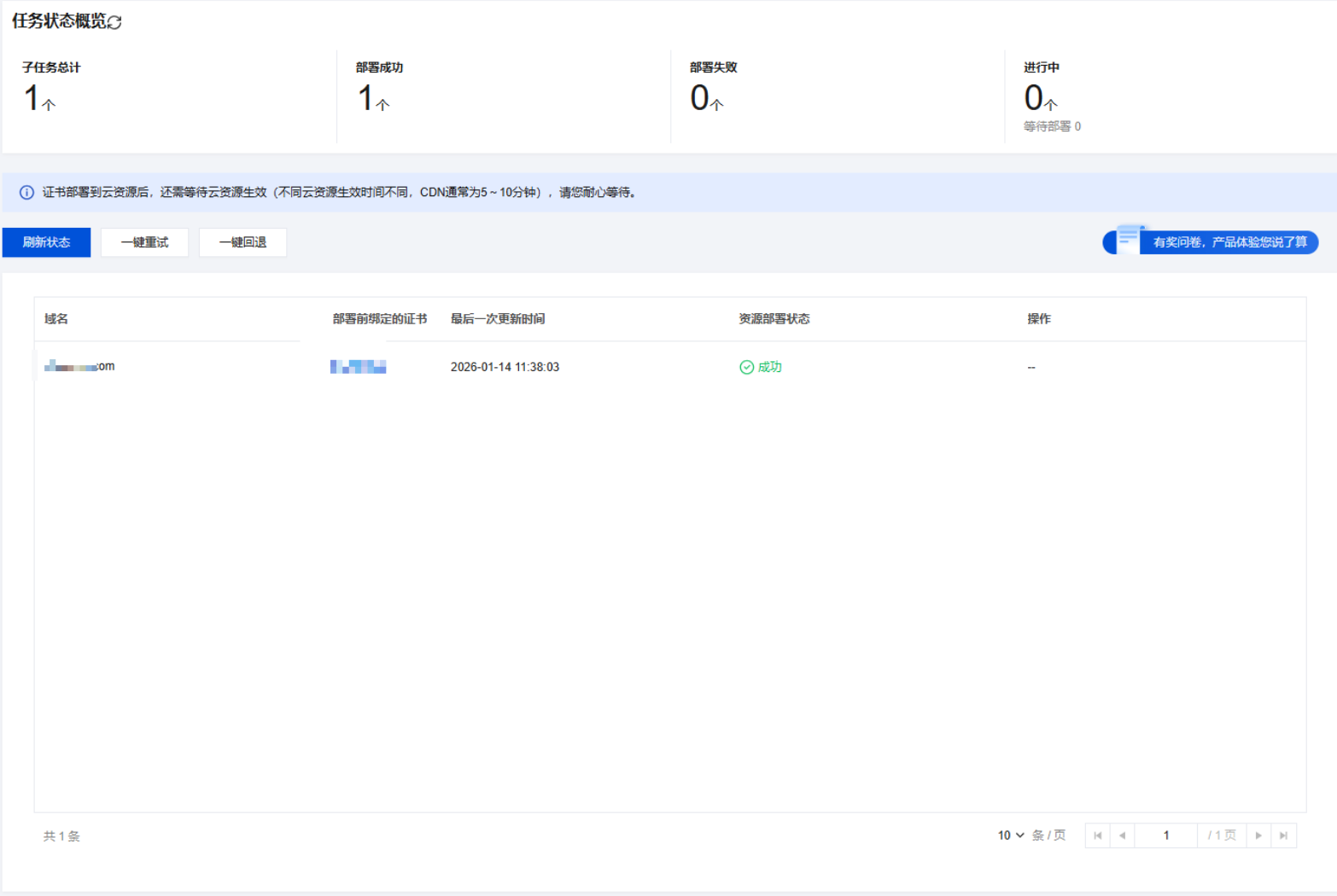 功能将云资源回退到这次部署前的证书。