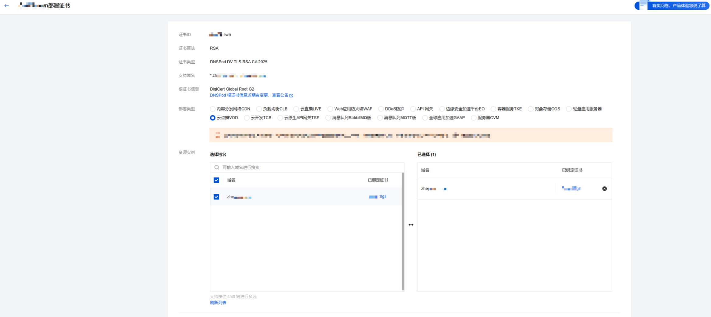 ,选择您需要部署的证书,并单击