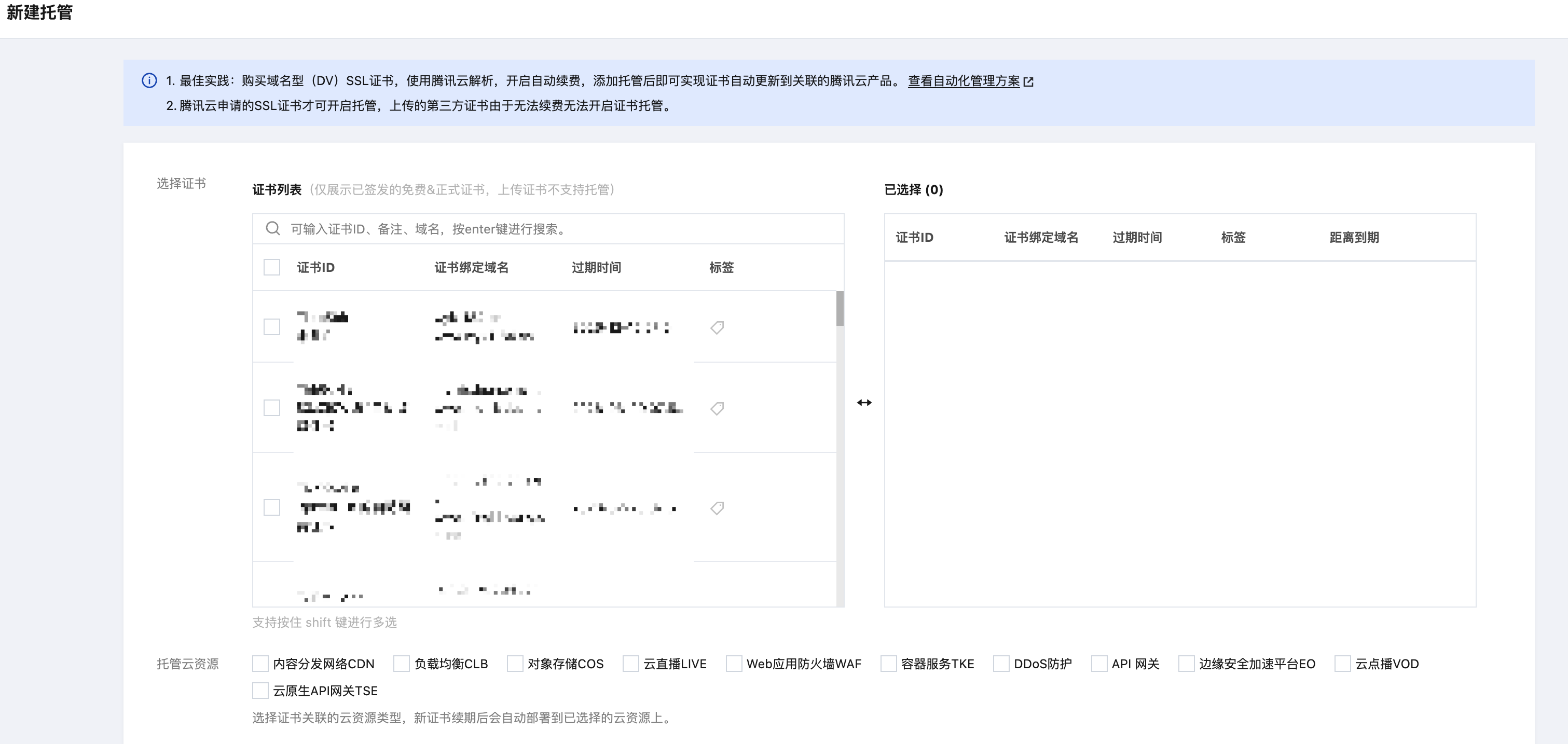 2. 在新建托管页面,选择要托管的证书,勾选托管的云资源,预设资源替换的时间。