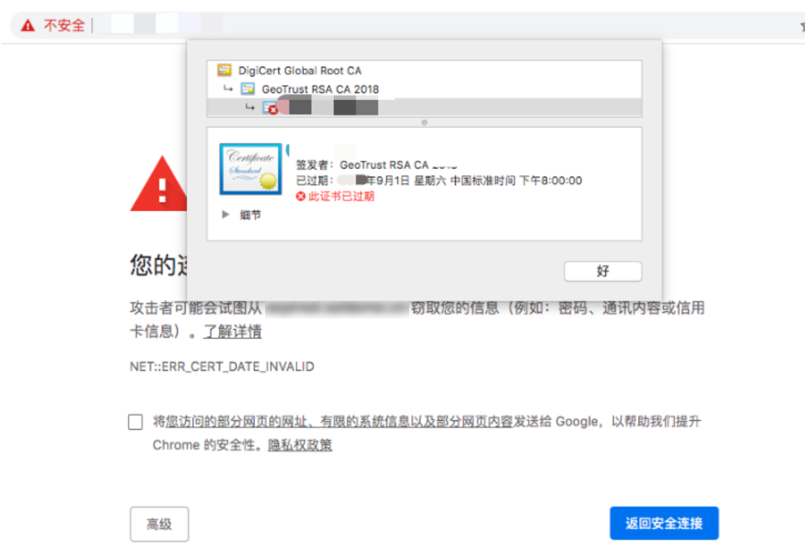 如果 SSL 证书过期没有续费,用户访问网站时会显示“网站的安全证书已过期”的警告信息,导致用户出于安全考虑停止访问网站;也有不法分子利用过期的SSL 证书,篡改或窃取浏览器与服务器之间传输的信息和数据,影响用户的数据安全。