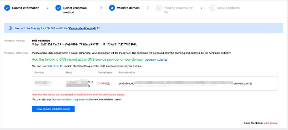 1. On the "validate domain" page, please carry out the domain verification operation according to the information provided on the page. For instance, if you have chosen the DNS verification method, the following information will be displayed, as shown in the figure below:
