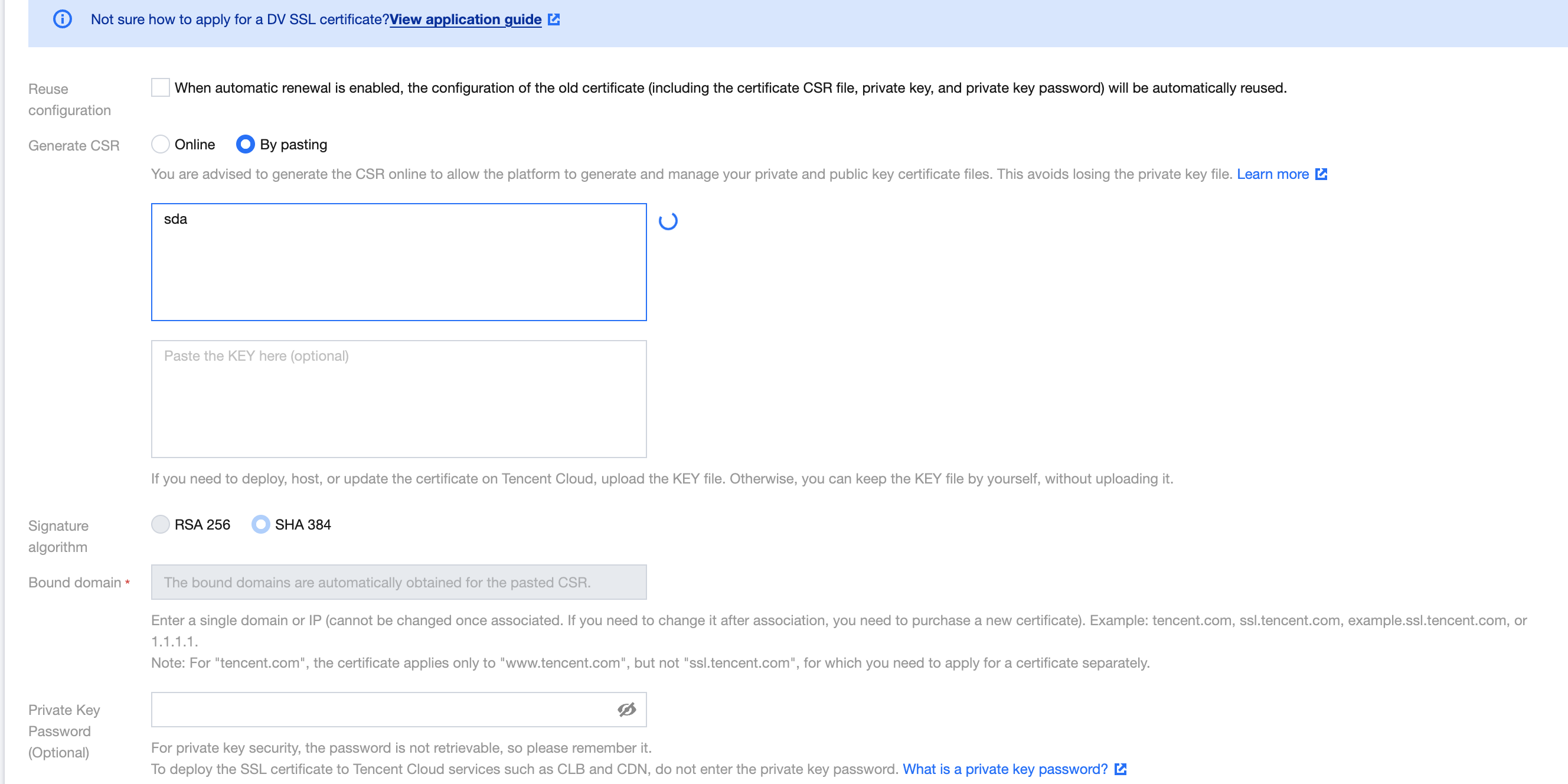 Bound domain: Enter a single domain to bind the certificate to, such as tencent.com or ssl.tencent.com.