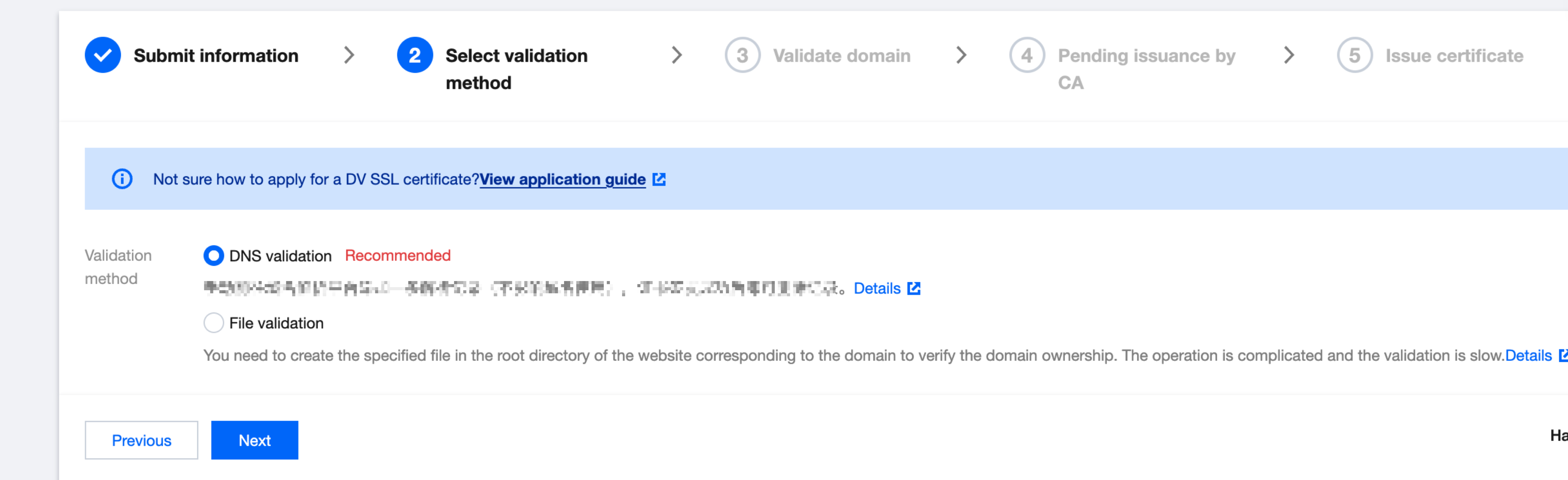 If a DNSPod GM (SM2) DV certificate has been applied for the same domain name under the same company name within the past 13 months, domain validation will not be required.