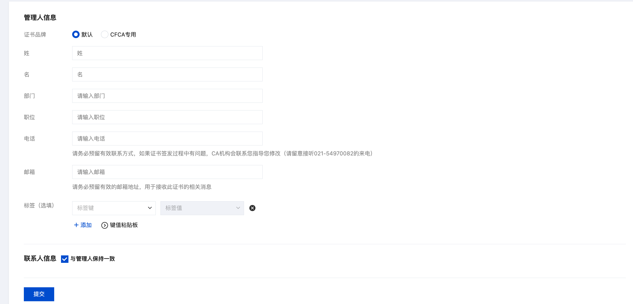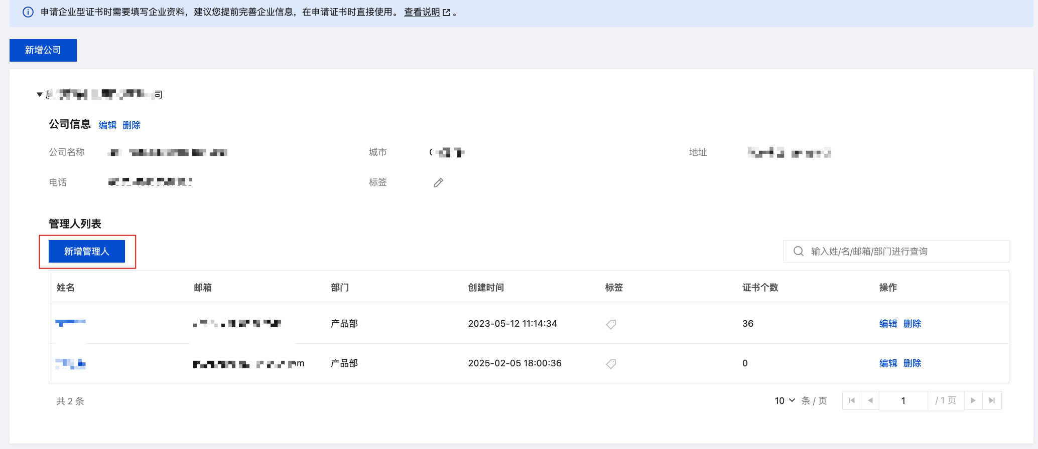 公司资料信息可拥有多个管理人,通过提前配置管理人信息并且已完成审核,申请证书时提交资料流程可以直接选择 “已有管理人” 资料信息,可避免您在申请多个证书的情况下重复填写资料内容,并跳过相关信息审核,快速申请证书。