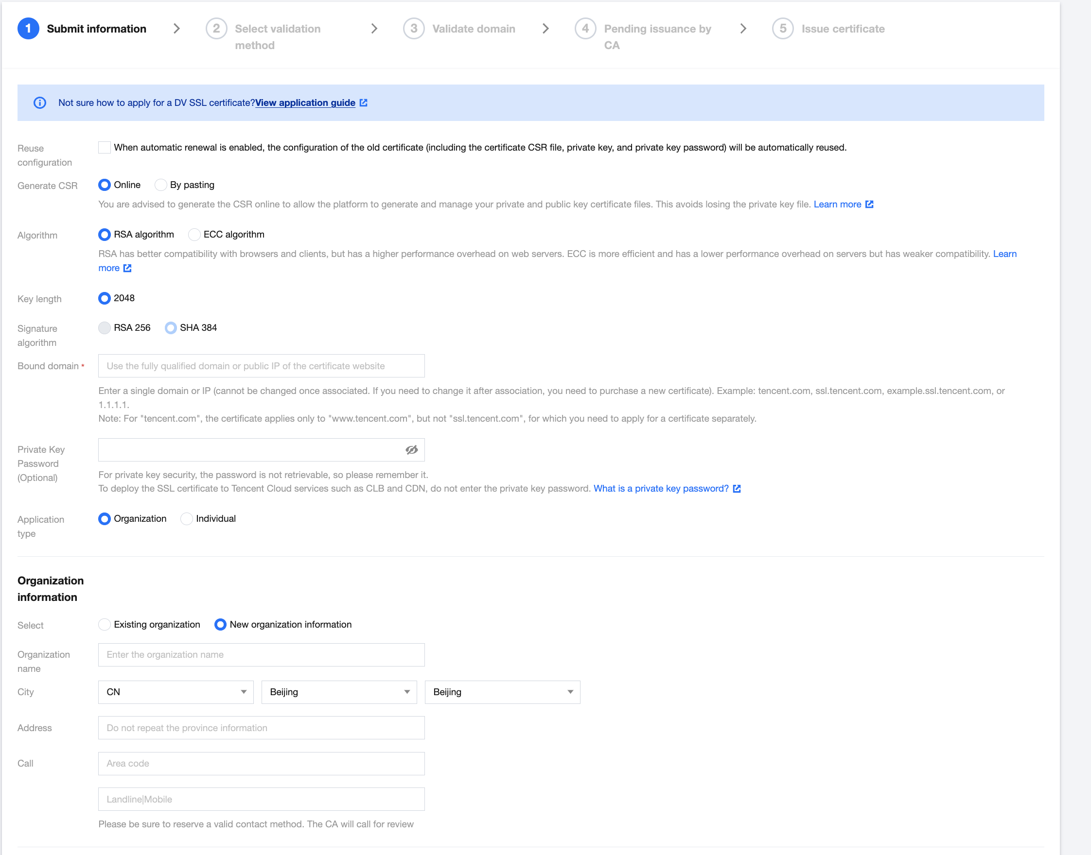 Log in to the SSL Certificate Service Console and follow the on-screen instructions to issue a certificate. (The screenshot shows the issuance of OV/EV type certificates; issuing a DV type certificate does not require company information.)