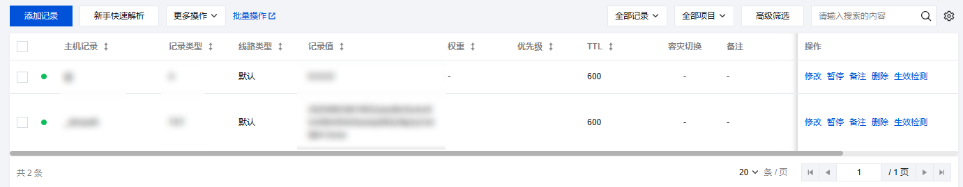 TTL:为缓存时间,数值越小,修改记录各地生效时间越快,默认为600秒。