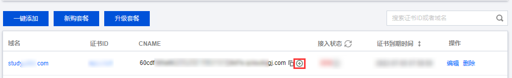 1. 在一键HTTPS(安全防护版)页面,查看您需要进行配置 CNAME 记录的实例,单击