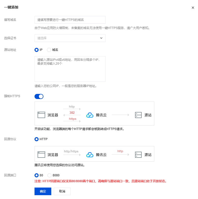 回源端口:请根据您的实际需求选择回源端口。默认情况下支持80或8080端口。
