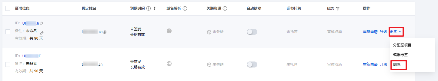 若已申请证书,待验证的证书在取消审核后,才可删除该证书。