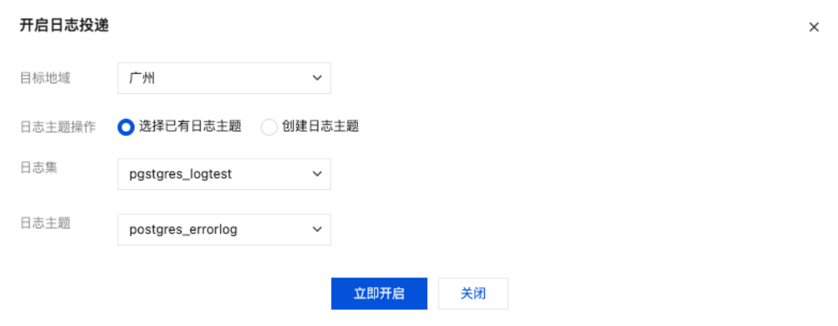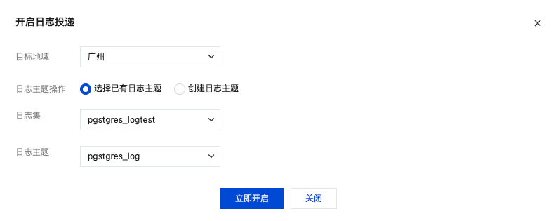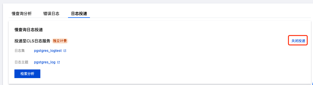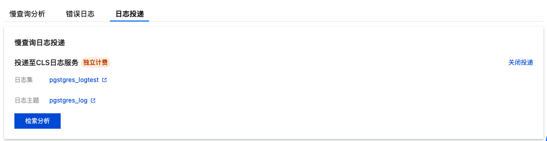 云数据库 PostgreSQL 提供日志投递功能,通过日志投递,可采集来源为云数据库 PostgreSQL 实例的慢日志和错误日志数据,并投递至日志服务(Cloud Log Service,CLS)进行分析,以便快速监控和定位业务问题。本文为您介绍如何通过控制台开启或关闭日志投递功能。