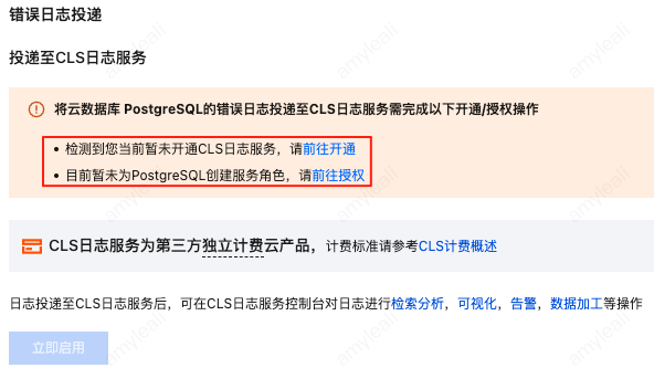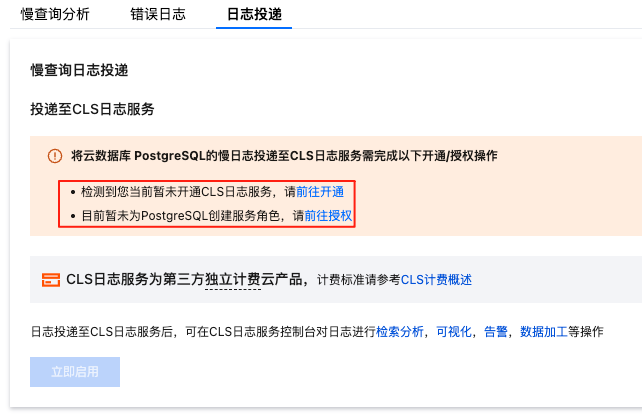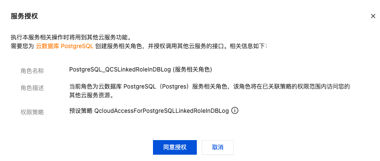 3. 首次启用日志投递功能需要开通 CLS 日志服务和为 PostgreSQL 创建服务角色,并完成授权。如果已完成,则忽略。