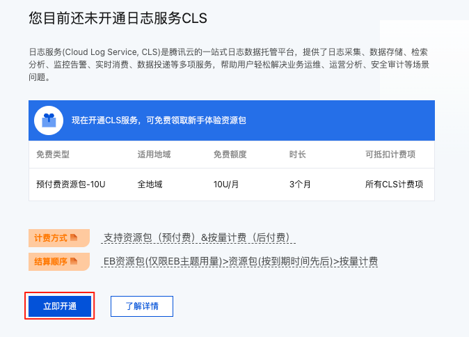 3.1.2 单击立即开通,开通 CLS 日志服务。