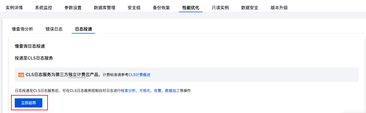 4. 在慢查询日志投递中,单击立即启用按钮。
