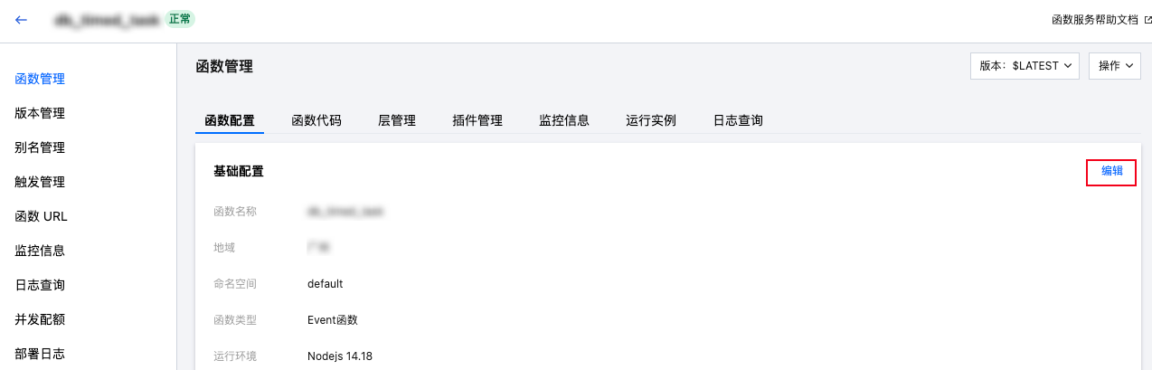 创建完毕,在控制台单击函数 ID 进入函数管理 > 函数配置页面,单击编辑。