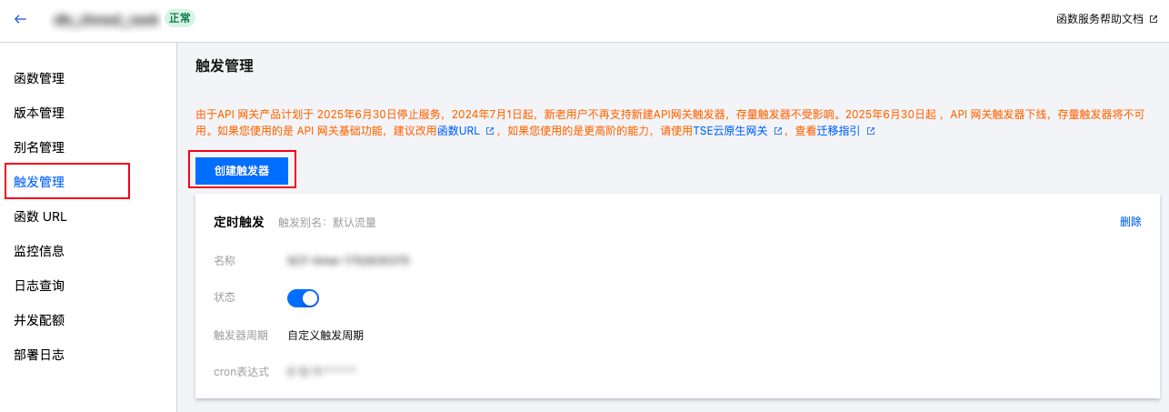 对于触发器,您可在触发管理页面中进行创建和删除。触发器不支持修改,您可删除原触发器后重新建立。