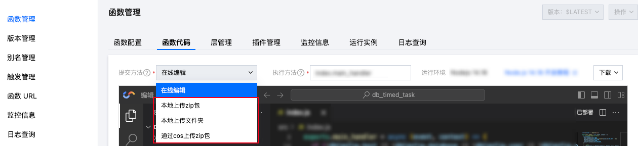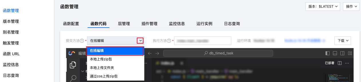 进入函数管理 > 函数代码页面,选择提交方法为在线编辑。