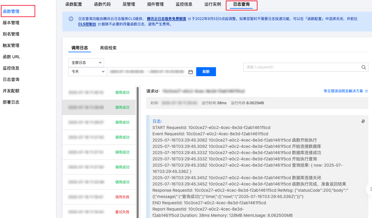 单击测试,在日志查询中查看运行日志返回的信息,根据日志信息定位问题,从而进一步解决。