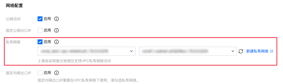 在网络配置中,开启私有网络,选择与需要操作的数据库实例相同的 VPC ,并指定子网。