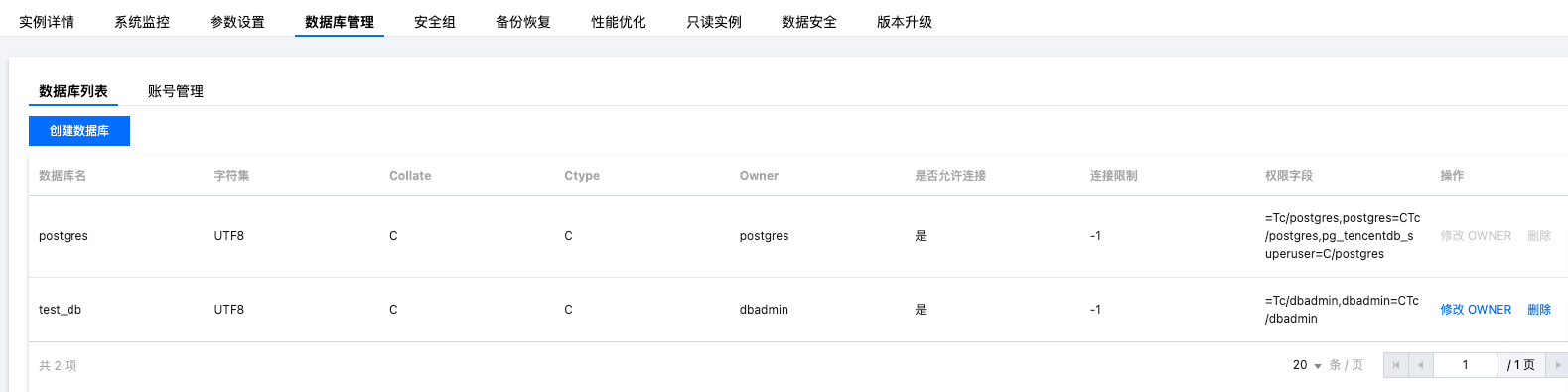 支持 PUBLIC 角色的权限操作能力的内核版本为 v13.22_r1.26、v14.19_r1.35、v15.14_r1.20、v16.10_r1.15、v17.6_r1.9 及以上版本。历史内核小版本的云数据库 PostgreSQL 的实例需要先 升级内核小版本 才能使用该能力。
