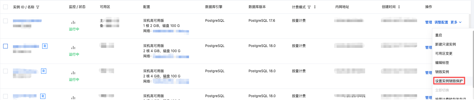 列表视图:在实例列表中找到目标实例,在操作列选择更多 > 设置实例销毁保护。
