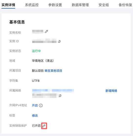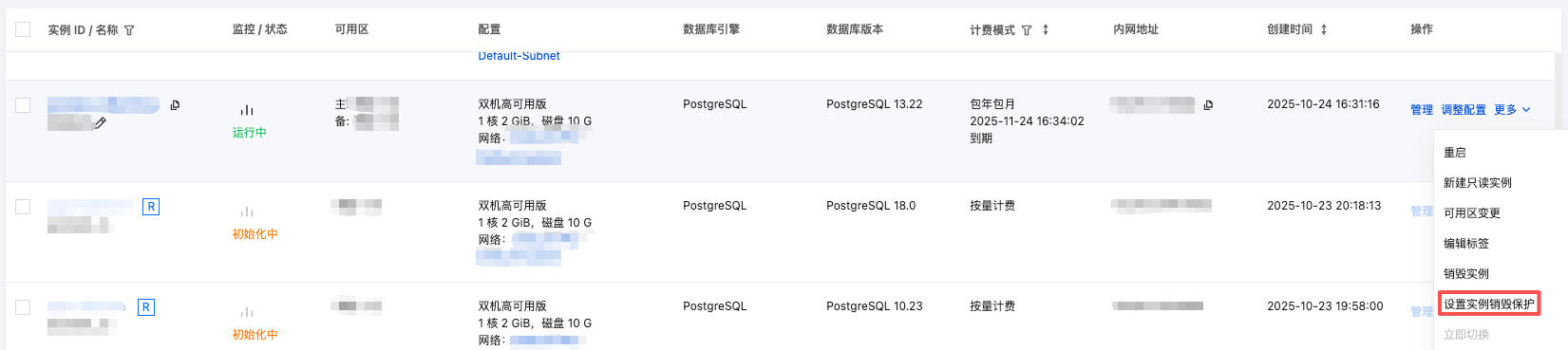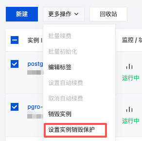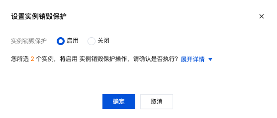 新购实例及已有实例默认关闭实例销毁保护,您可按需开启。