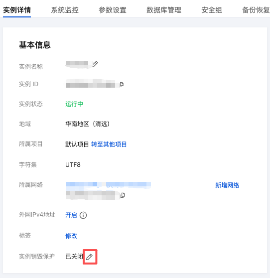 页签视图:选择实例详情 > 基本信息 > 实例销毁保护。如下图所示: