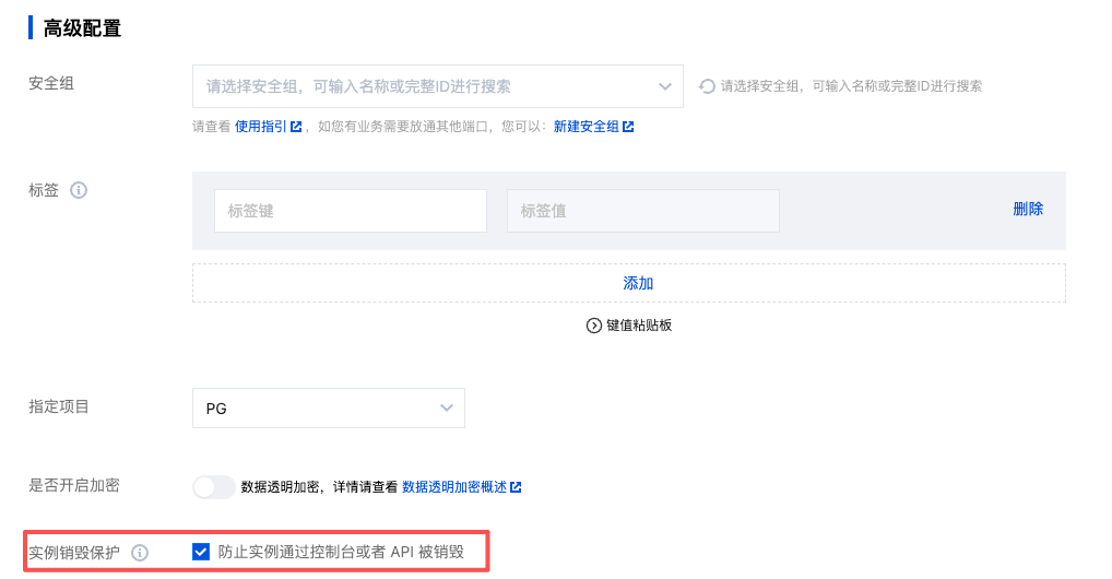 在新购实例时,勾选高级配置 > 实例销毁保护后的防止实例通过控制台或 API 被销毁。如下图所示: