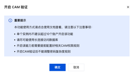 如果用户对安全性有较高要求,可以通过本功能将 CAM 与数据库账号验证相绑定,用户在请求时可获取对应的密码来访问数据库,以提升数据库的安全性。我们建议如下两种场景,启用 CAM 验证。