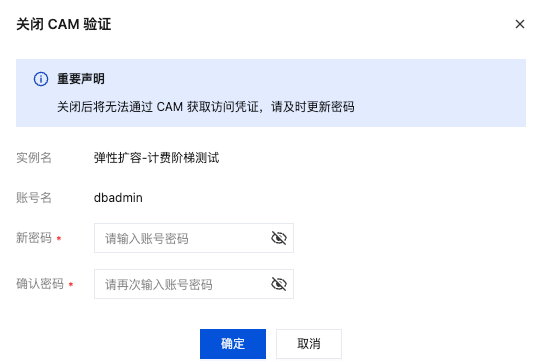 关闭 CAM 验证后将无法通过 CAM 获取访问凭证,因此在关闭 CAM 验证时需要输入一个新密码。