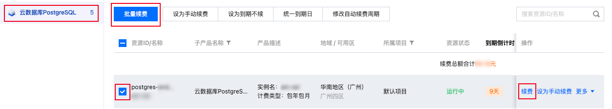 1. 登录 费用中心 > 续费管理 页面,选择云数据库 PostgreSQL。对目标实例,单击操作列的续费,或批量勾选后点击上方的批量续费按钮。