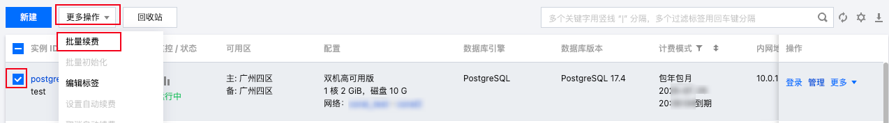 1. 登录 云数据库 PostgreSQL 控制台,进入实例列表,勾选实例后,单击更多操作 > 批量续费。