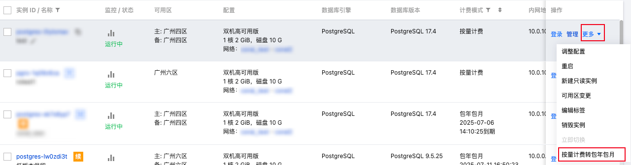 1. 登录 云数据库 PostgreSQL 控制台,进入实例列表,在操作列单击更多 > 按量计费转包年包月。