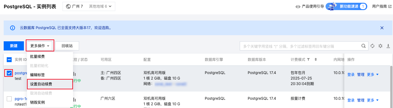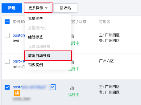 1. 登录 云数据库 PostgreSQL 控制台,在实例列表选择一个或多个实例,在上方选择更多操作 > 设置自动续费。