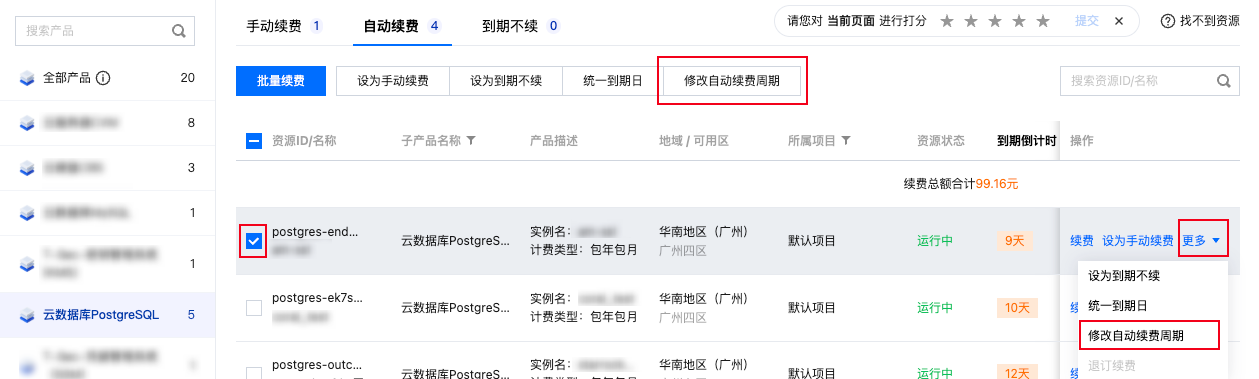 服务内容:云数据库 PostgreSQL 实例自动续费。