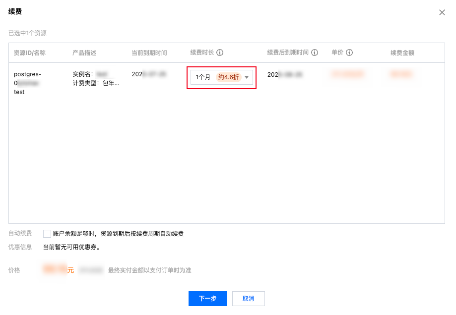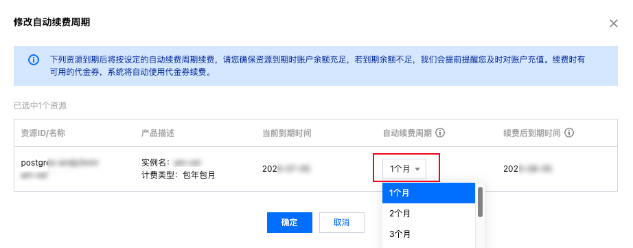 自动续费周期:以您设置的自动续费周期及模式为准。例如,您选择的周期为1个月,系统即在每次到期时自动续费1个月。