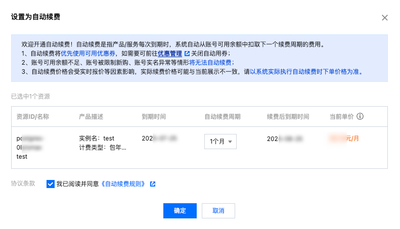 2. 在弹窗中确认产品信息,选择自动续费周期,确认无误后勾选同意《自动续费规则》,单击确定。