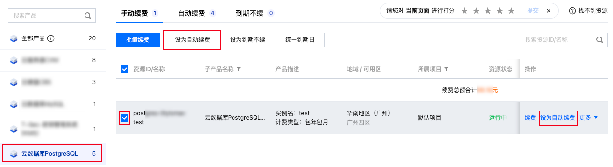 1. 登录 费用中心 > 续费管理 页面,选择云数据库 PostgreSQL > 手动续费。在操作列选择设为自动续费,或批量勾选实例后,单击上方的设为自动续费按钮。