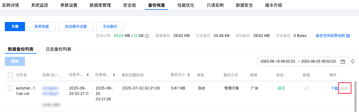 2. 选择备份恢复页,在数据备份列表或日志备份列表的操作列,单击删除。