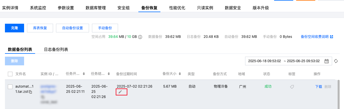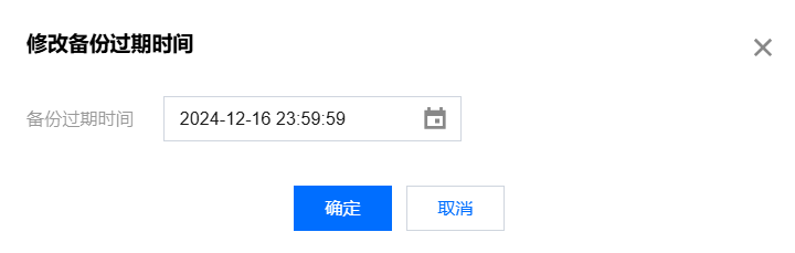 若您只希望更改某个特定备份文件的存在时长,可在实例管理的备份恢复页,单击备份过期时间的